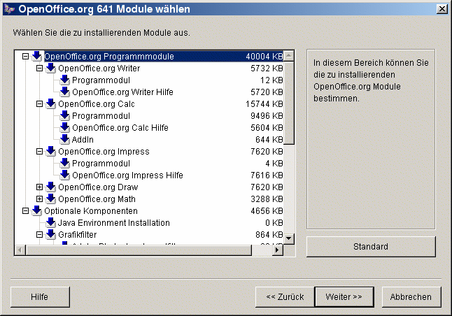 Wenn Sie die Dialogoption Modifizieren wählen, sehen Sie denselben Dialog wie bei der benutzergesteuerten Installation, in dem Sie wählen können, welche Komponenten von OpenOffice.org Sie hinzufügen oder entfernen wollen.